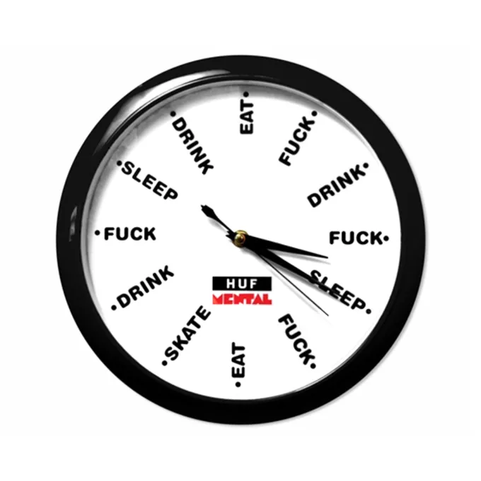 Esta colaboração entre a HUF e a Skate Mental é o relógio de parede ideal para quem não precisa fazer teleconferências às 13h. O relógio lembra quando é hora de comer, beber, dormir e rasgar os lençóis. Embora não ajude você a se recuperar de muitas ressacas, ajudará sua vida a se tornar um...