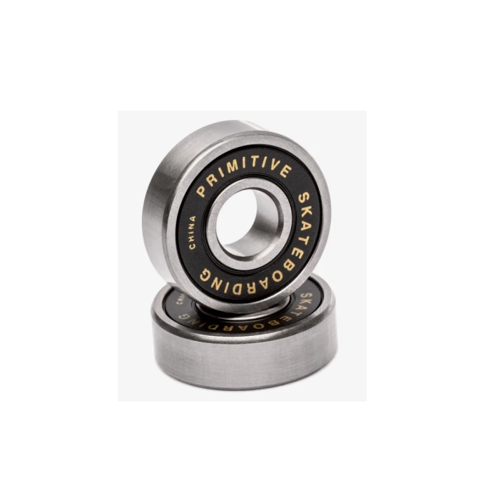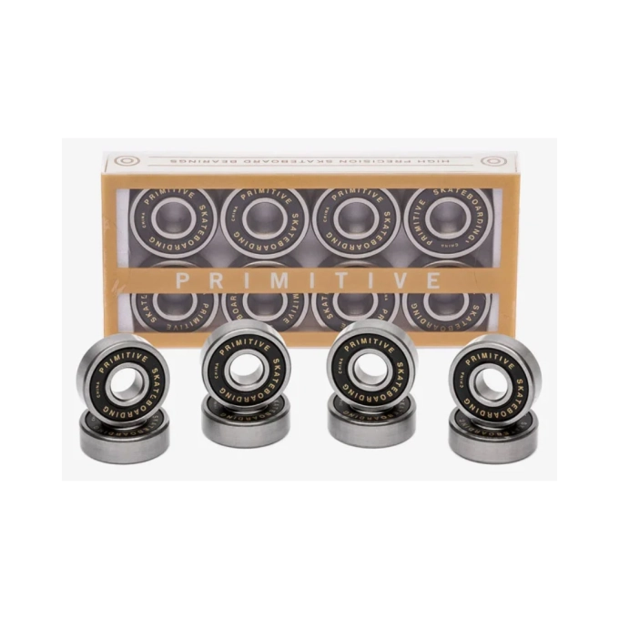 Rolamentos de esferas de aço premium com gaiola de nylon para redução de peso e atrito; proteção de borracha única, sem contato e removível para fácil limpeza e menor atrito; muito duráveis e pré-lubrificados. Conteúdo: 8 rolamentos Primitive.